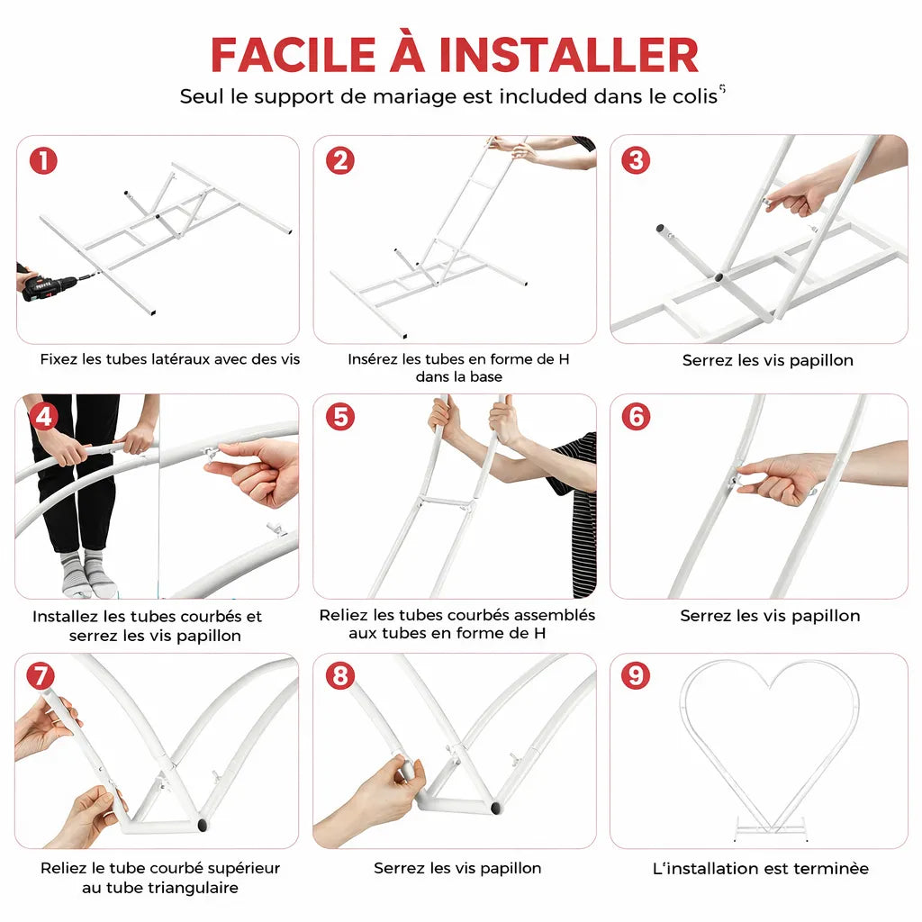 Pensée pour symboliser l’amour et l’union, cette arche en forme de cœur séduit par ses lignes harmonieuses et sa structure équilibrée. Son tracé fluide apporte douceur et élégance à l’espace, sans alourdir la mise en scène. Sa conception élancée permet d’encadrer parfaitement les mariés lors de l’échange des vœux ou des photos. Véritable pièce maîtresse décorative, elle attire naturellement les regards et crée une ambiance romantique mémorable.
