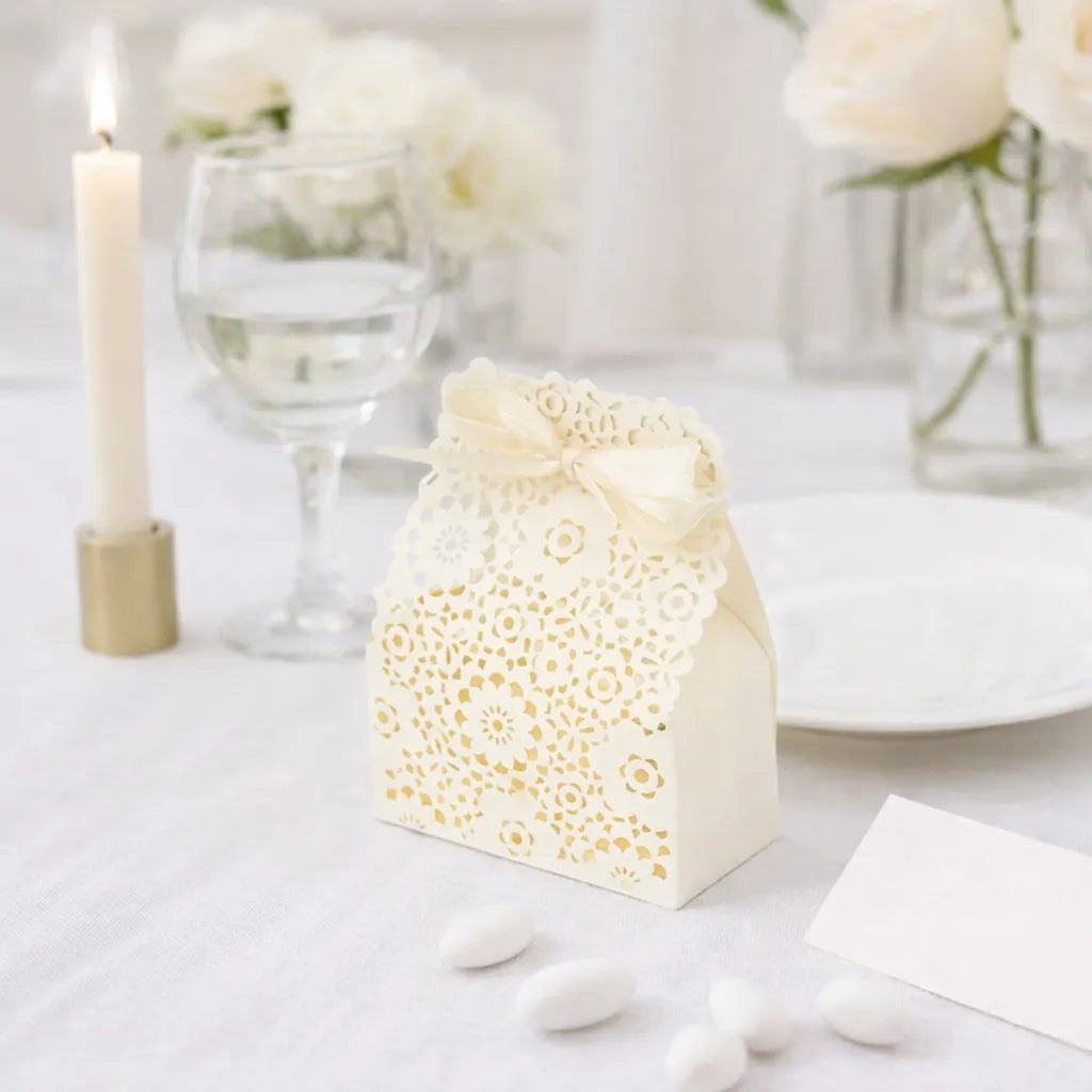 Cette boîte à dragées fleurie épurée séduit par son design ajouré délicatement travaillé. Les motifs floraux finement découpés créent un jeu de lumière subtil qui apporte douceur et raffinement à votre décoration de table. Parfaite pour un mariage chic, romantique ou printanier, elle met en valeur vos dragées tout en restant sobre et élégante. Un détail décoratif qui transforme chaque place en véritable composition harmonieuse.