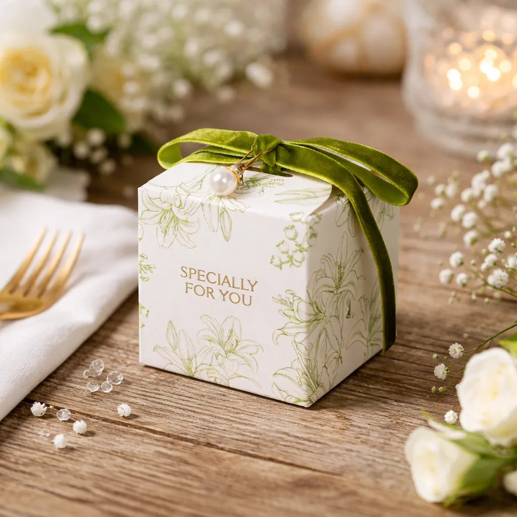 Conçue avec un carton solide et bien formé, cette boîte assure une excellente tenue pendant toute la célébration. Son impression végétale reste nette et subtile, tandis que le ruban apporte une touche finale harmonieuse. Stable et résistante, elle protège efficacement vos gourmandises sans se déformer. À la fois pratique et décorative, elle devient un souvenir raffiné que vos invités auront plaisir à conserver.