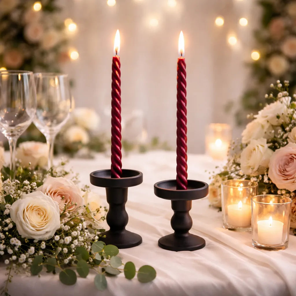 Ces bougies spirales rouges vin attirent l’œil par leur silhouette élancée et leur teinte profonde, parfaite pour structurer une décoration de table élégante. Leur relief spiralé capte la lumière et crée une atmosphère chaleureuse, idéale pour les dîners soignés, les fêtes ou les moments partagés. Elles apportent du caractère sans surcharger l’espace, et s’intègrent aussi bien dans un décor moderne que dans une mise en scène plus traditionnelle.