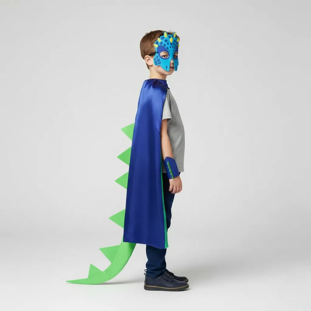 Cette cape de dinosaure ludique se distingue par un design vibrant mêlant bleu profond et crêtes vertes éclatantes, créant une silhouette dynamique qui inspire immédiatement le jeu imaginatif. Conçue pour offrir une immersion totale, elle transforme chaque enfant en petit explorateur préhistorique prêt à vivre des histoires épiques. Sa forme fluide et ses détails graphiques apportent une touche de fantaisie irrésistible aux moments de déguisement.