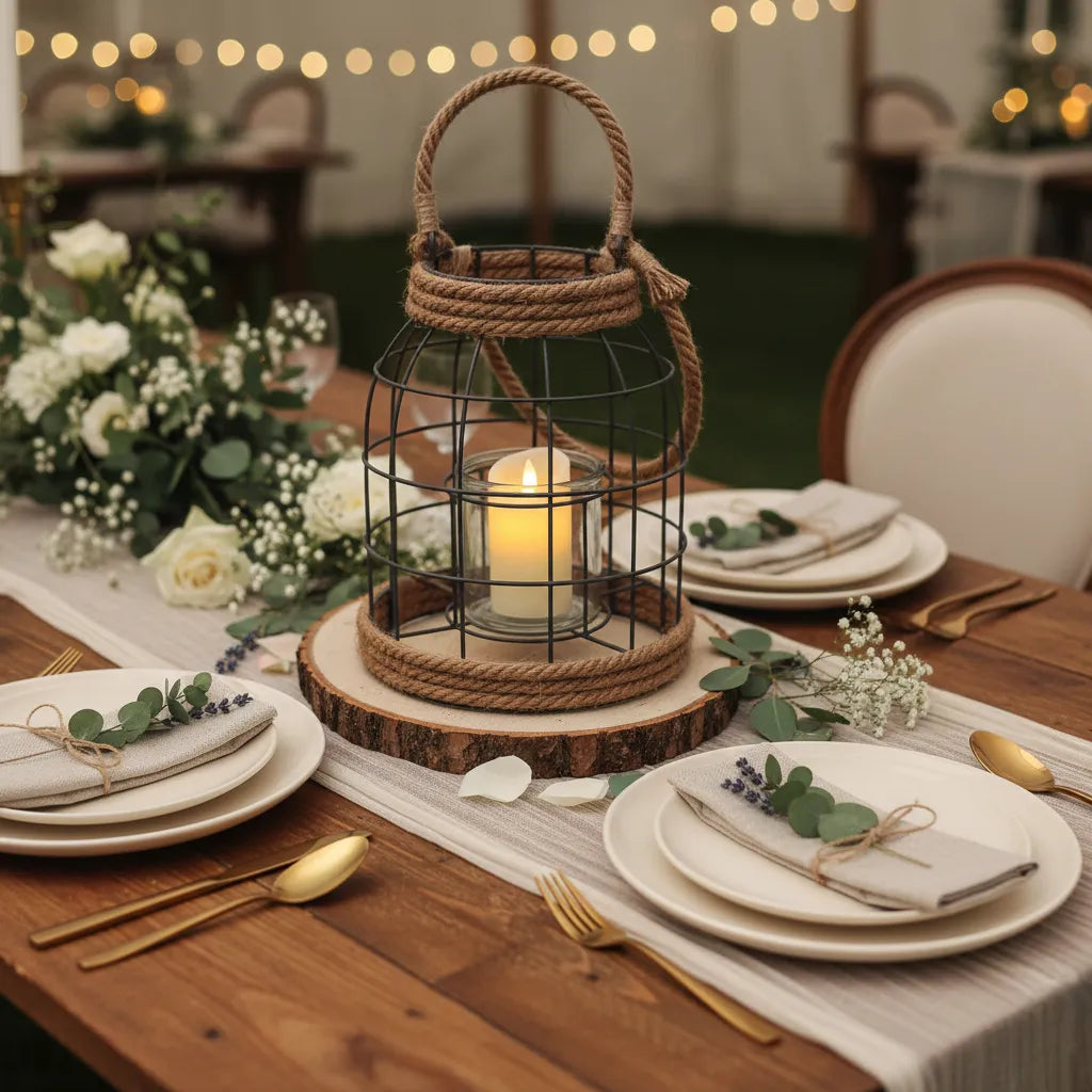 Le design de ce bougeoir a été imaginé pour s’intégrer harmonieusement aux décorations naturelles et élégantes. Les lignes simples et les matériaux bruts rappellent l’univers champêtre tout en restant raffinés. La structure laisse passer la lumière de la bougie pour créer une ambiance intimiste et romantique. Ce centre de table devient un véritable élément décoratif, parfait pour mettre en valeur une réception de mariage chaleureuse et authentique.