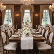 Le design de ce chemin de table repose sur des motifs tropicaux fins et élégants, associés à une palette blanc et doré très tendance. Les lignes délicates des feuillages apportent légèreté et sophistication à l’ensemble de la table. Ce style équilibré permet de créer une décoration à la fois exotique et chic, sans surcharge visuelle. Il s’intègre parfaitement dans une ambiance moderne, naturelle ou festive.
