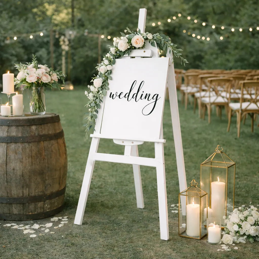 Ce chevalet blanc en bois est l'accessoire idéal pour mettre en valeur vos panneaux décoratifs et menus lors de votre mariage. Avec son design simple et élégant, il apporte une touche de sophistication à votre événement. Facile à installer et à ajuster, il s'adapte à tous vos besoins de présentation, tout en s'harmonisant parfaitement avec toutes les ambiances de mariage, qu'elles soient modernes ou traditionnelles.