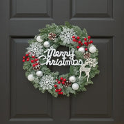 Plongez dans la magie de l’hiver avec cette magnifique couronne de Noël aux flocons de neige étincelants. Son feuillage enneigé s’illumine de baies rouges, de boules argentées et d’un élégant message “Merry Christmas”. Parfaite pour créer une ambiance chaleureuse et festive, elle évoque la douceur des fêtes et la beauté des paysages enneigés. Une décoration raffinée qui apporte éclat et féerie à votre intérieur.