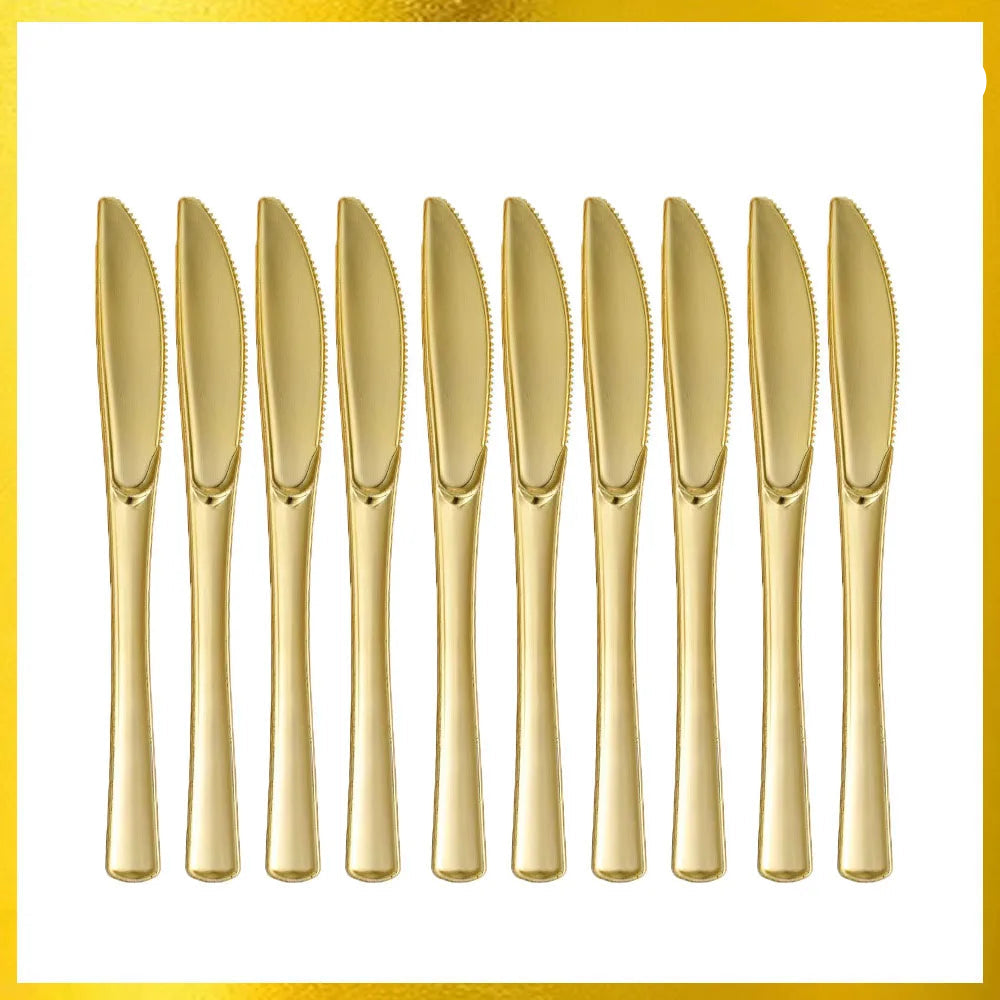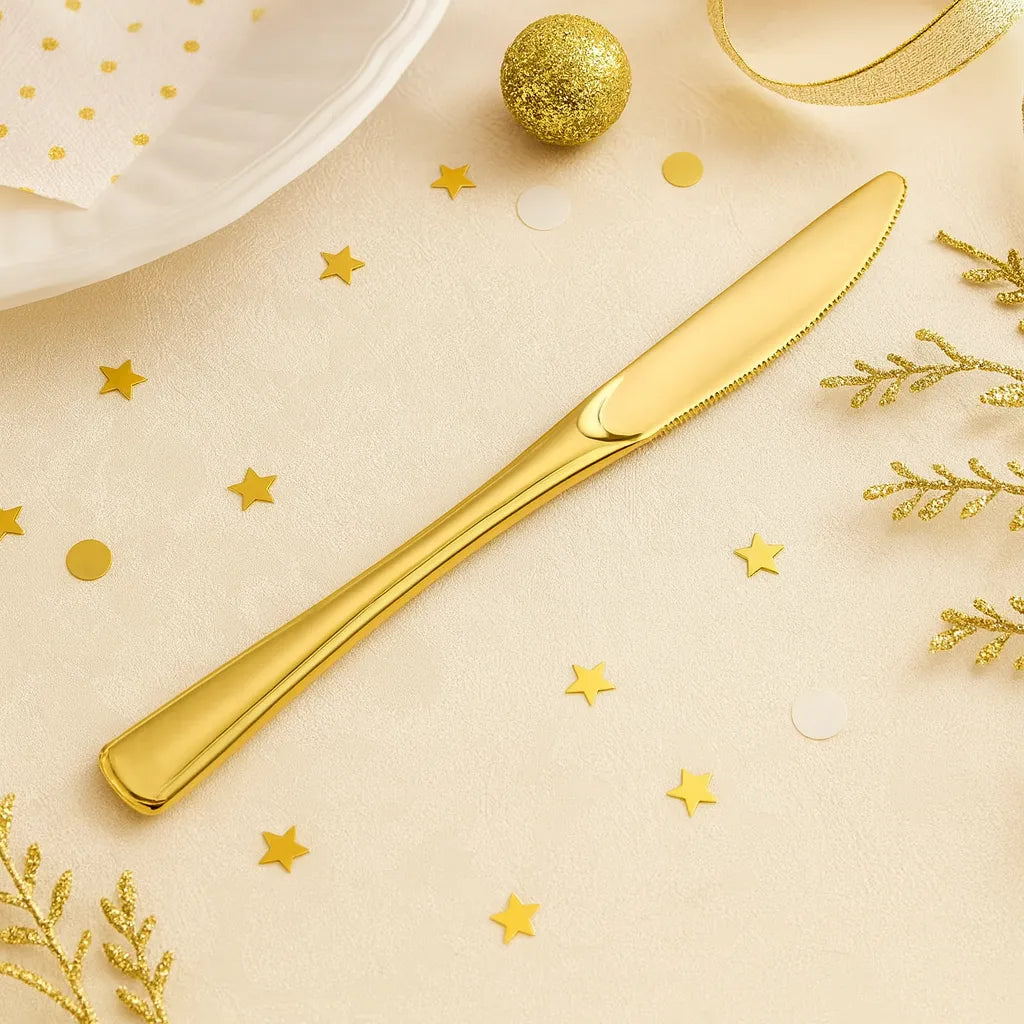 Chaque couteau est soigneusement moulé pour garantir une bonne prise en main et une coupe efficace. Leur couleur dorée illumine votre table et s’accorde parfaitement avec une décoration de fête tendance. Une vaisselle jetable, oui — mais avec du style !