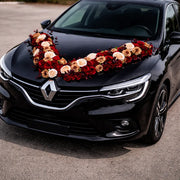 Cette déco florale artificielle pour capot de voiture de mariage se distingue par sa forme en V bien définie qui encadre le véhicule avec précision. L’alternance de fleurs rouges et crème crée un contraste visuel net tout en restant harmonieux. La disposition suit une ligne structurée qui met en valeur le capot sans surcharge. L’ensemble offre une décoration lisible, organisée et adaptée à une mise en scène élégante et moderne.