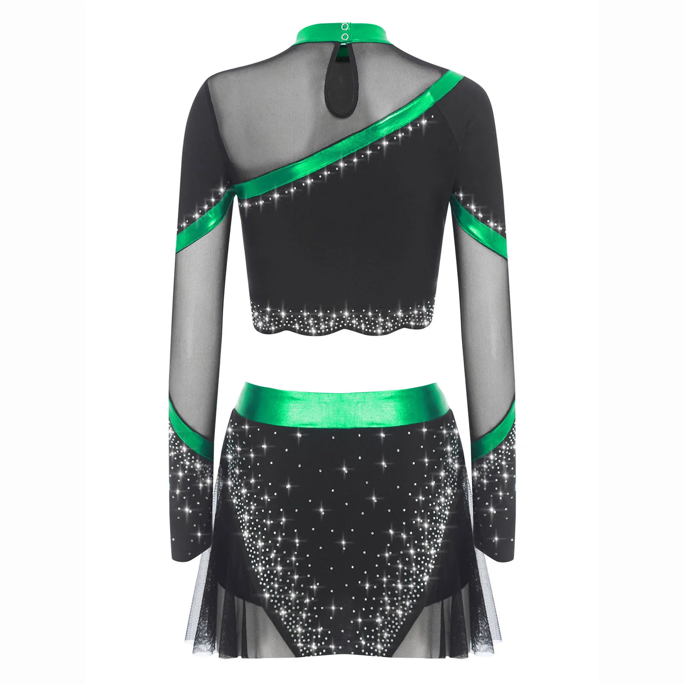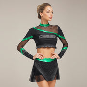 Grâce à ses matières brillantes, ce costume scintille à chaque mouvement, créant un effet visuel spectaculaire. Son design avec tulle et paillettes apporte élégance tout en conservant une allure sportive. Le haut structuré et la jupe fluide s’adaptent aux chorégraphies rapides, parfaites pour scènes, soirées ou événements festifs exigeant un style énergique et glamour.