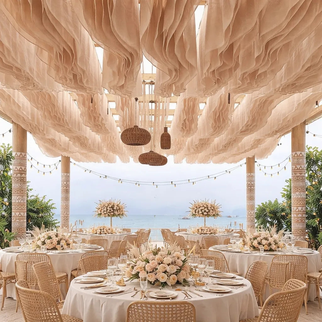 - Apportez une touche moderne et élégante à votre événement avec ce drapé de plafond contemporain ondulé nude, parfait pour créer une ambiance raffinée et aérée.
