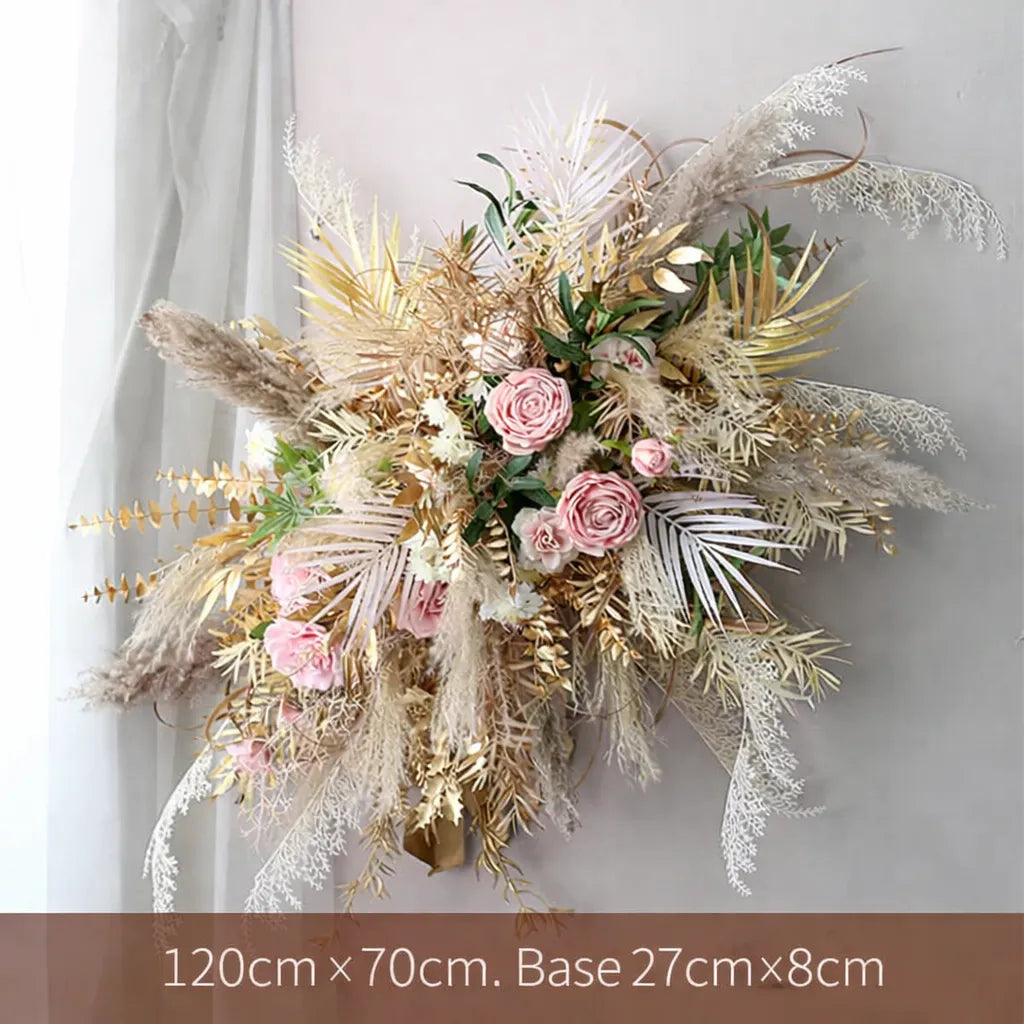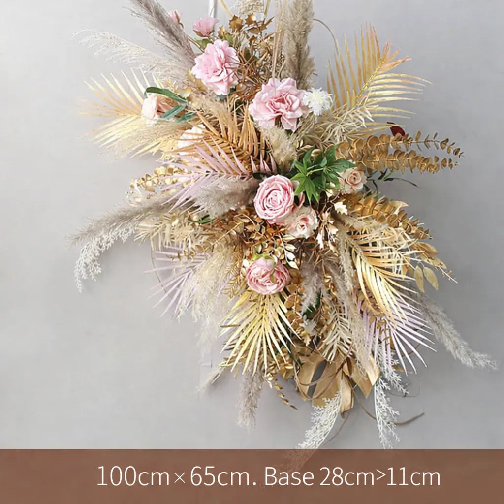 Apportez une touche bohème chic à votre mariage avec cette composition de fleurs séchées pensée pour sublimer votre arche. Son mélange harmonieux de pampas, feuillages délicats et fleurs aux tons nude et rosés crée un équilibre visuel raffiné. Le volume est travaillé pour encadrer élégamment les mariés sans alourdir l’espace. Chaque détail met en valeur la douceur des textures naturelles et l’authenticité d’un décor romantique et tendance.