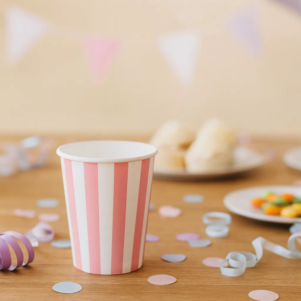 - Un Gobelet Jetable Rayé Rose avec un design original, pour un anniversaire plus que réussi.