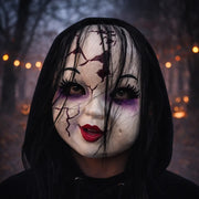 Les fissures peintes avec précision donnent une profondeur glaçante au masque, comme une poupée endommagée revenue d’entre les ombres.