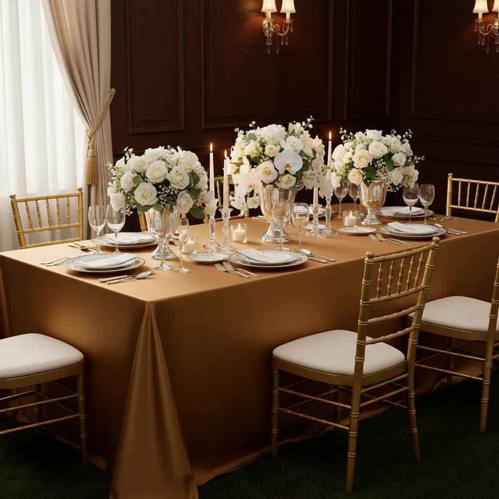 Apportez élégance et chaleur à votre réception avec notre Nappe Mariage Marron Satiné