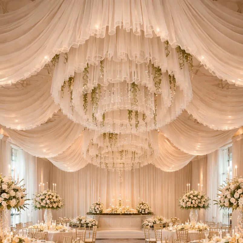 Apportez une touche de raffinement à votre mariage avec ce panneau de drapé champagne tutu, parfait pour créer une décoration de plafond élégante et aérienne.