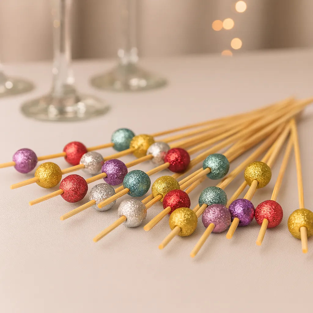 Les pics alimentaires scintillants se distinguent par leur finition éclatante qui capte la lumière et attire tous les regards. Leur design chic et festif apporte une touche de glamour à vos apéritifs, buffets ou desserts. Ils transforment chaque bouchée en une petite mise en scène élégante et raffinée.