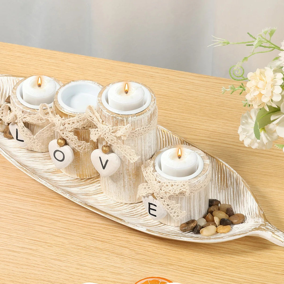 Son design romantique associe un plateau épuré à des bougeoirs décorés de cœurs et de rubans, créant une ambiance douce et chaleureuse.