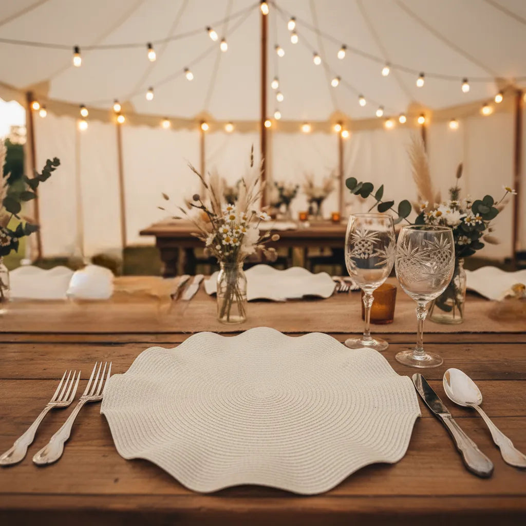 Structurez votre table avec notre collection de sets de table de mariage, conçue pour allier esthétique et praticité. Associez-les à nos nappes, chemins de table et assiettes de mariage pour une décoration de table mariage cohérente et raffinée sur l’ensemble de votre réception.