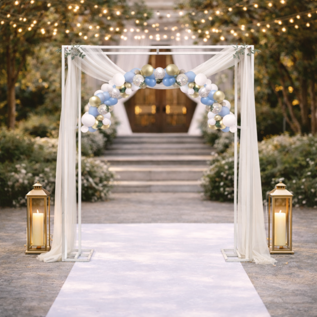 Ce support arche mariage élégant apporte immédiatement structure et raffinement à votre espace de cérémonie. Sa silhouette rectangulaire aux lignes épurées crée un cadre harmonieux qui met en valeur les mariés et les compositions florales. Son design aérien laisse circuler la lumière tout en conservant une présence visuelle forte. Idéal pour un mariage chic ou contemporain, il transforme votre décor en une mise en scène soignée et parfaitement équilibrée.