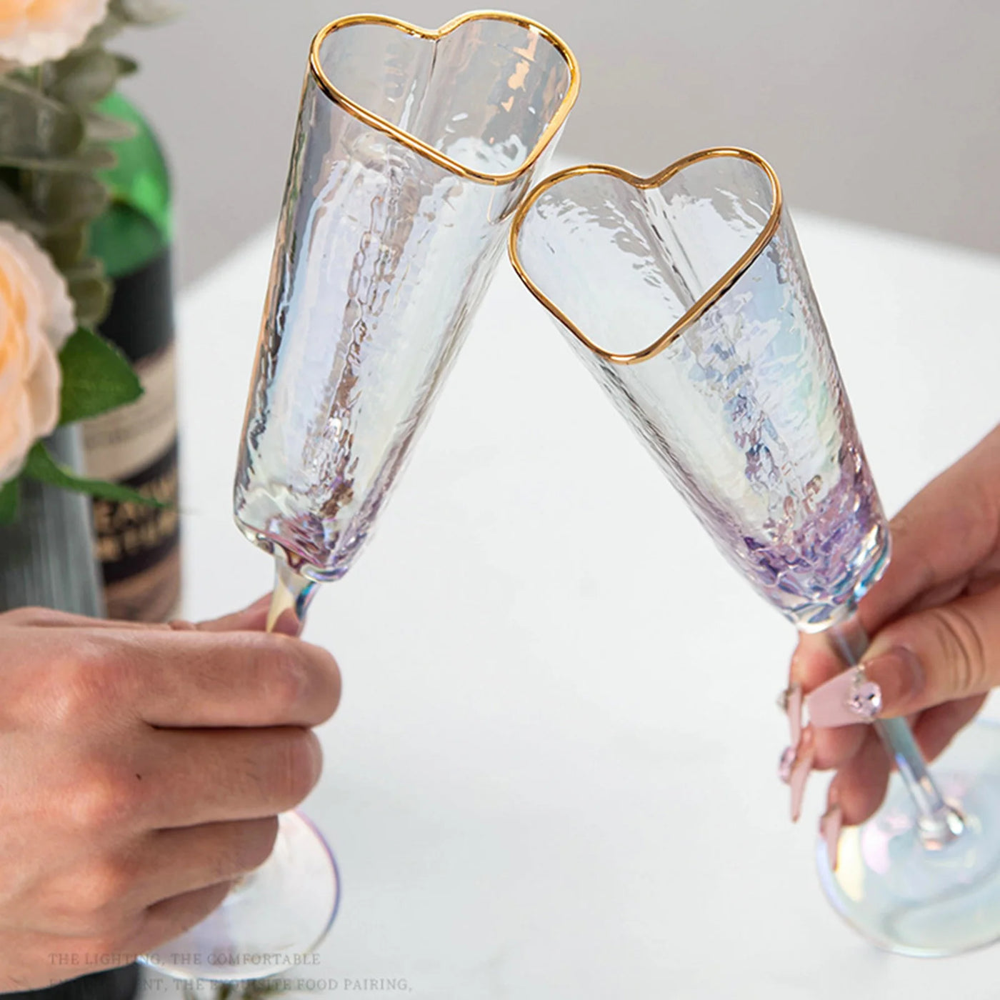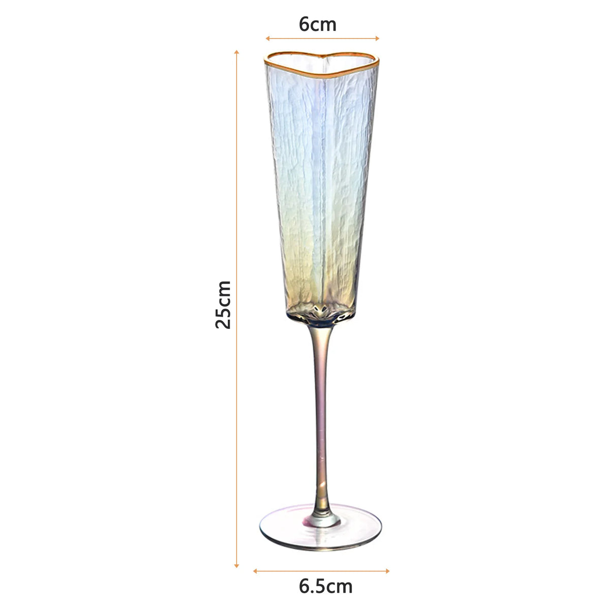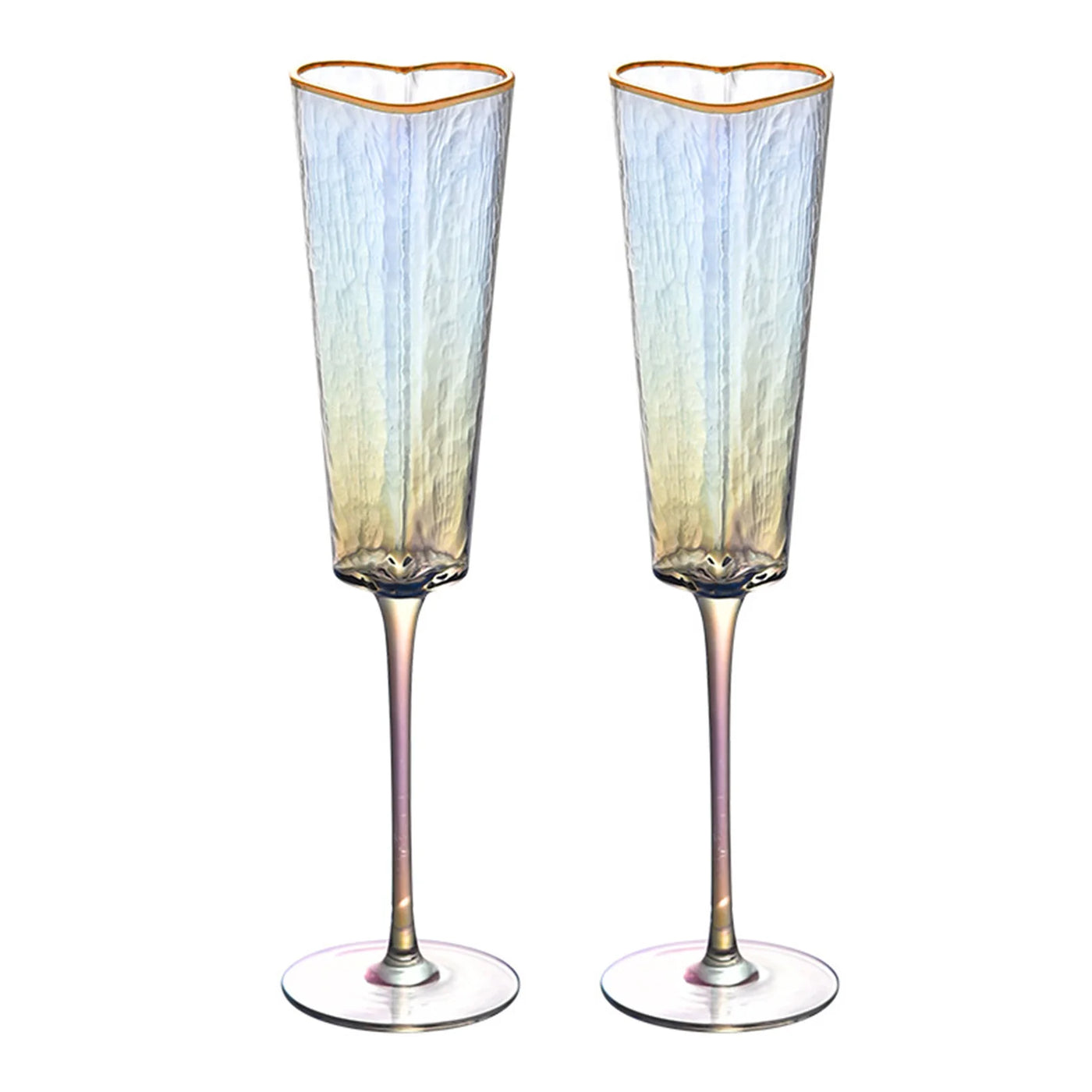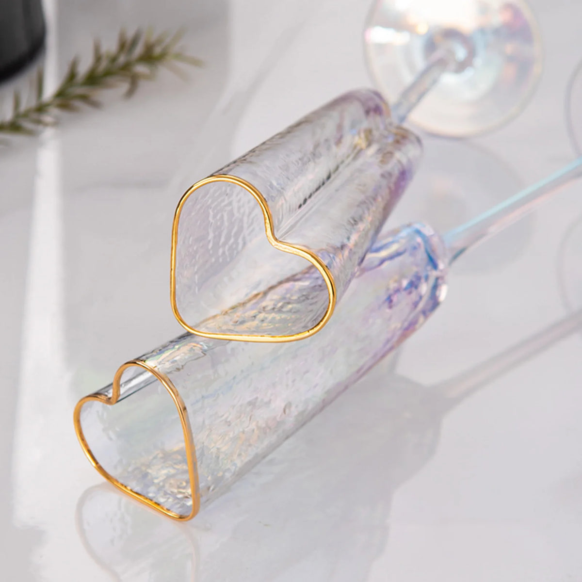 Ces verres à champagne en forme de cœur transforment n’importe quelle table en décor romantique grâce à leur finition dorée et leur verre coloré irisé. Chaque gorgée devient un moment précieux, parfait pour mariages, anniversaires ou dîners en amoureux. Leur forme longiligne met en valeur les bulles et sublime visuellement chaque dégustation raffinée.
